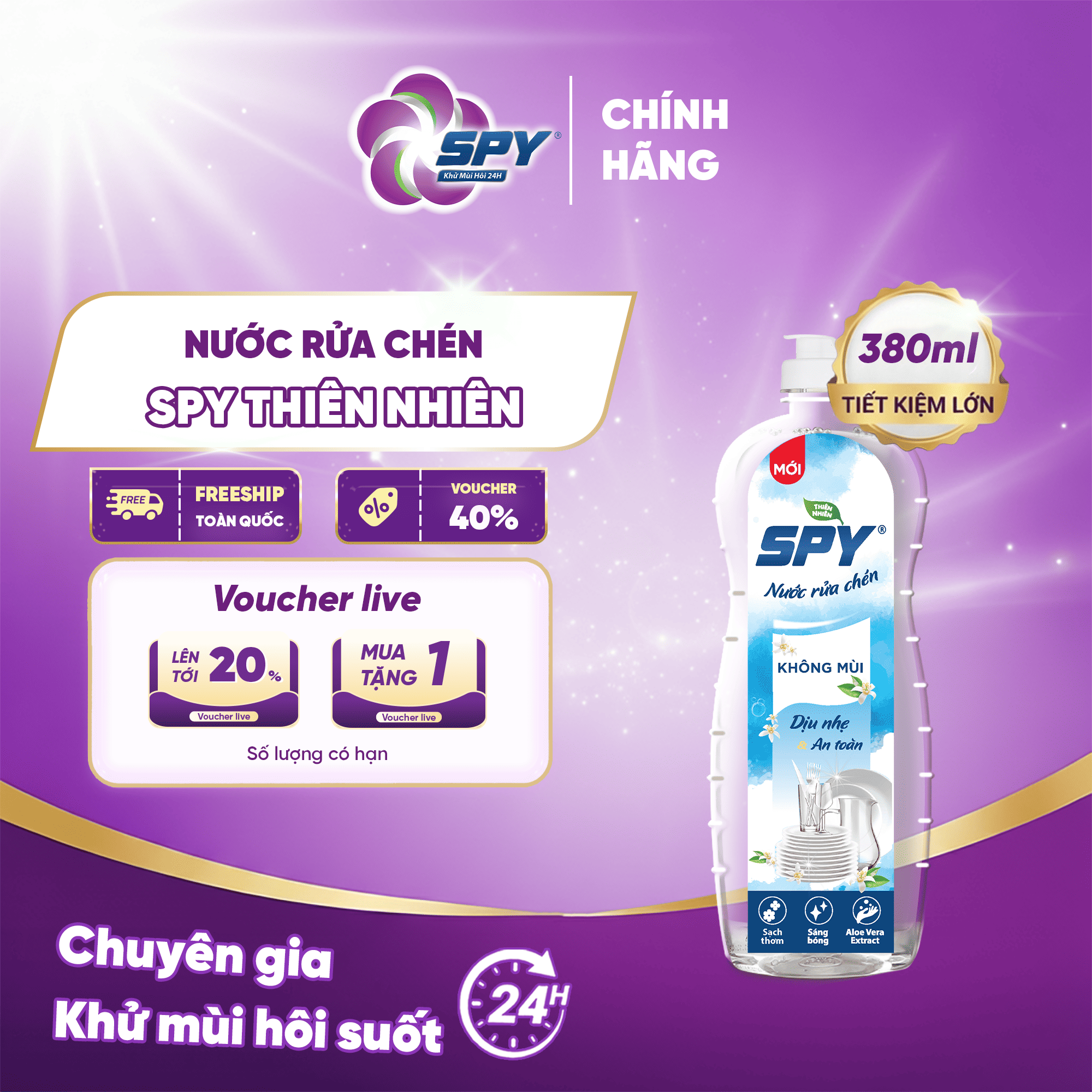 Nước rửa chén SPY thành phần thiên nhiên hương Quế, Gừng Sả khử mùi hôi tanh và xua đuổi côn trùng 380ml
