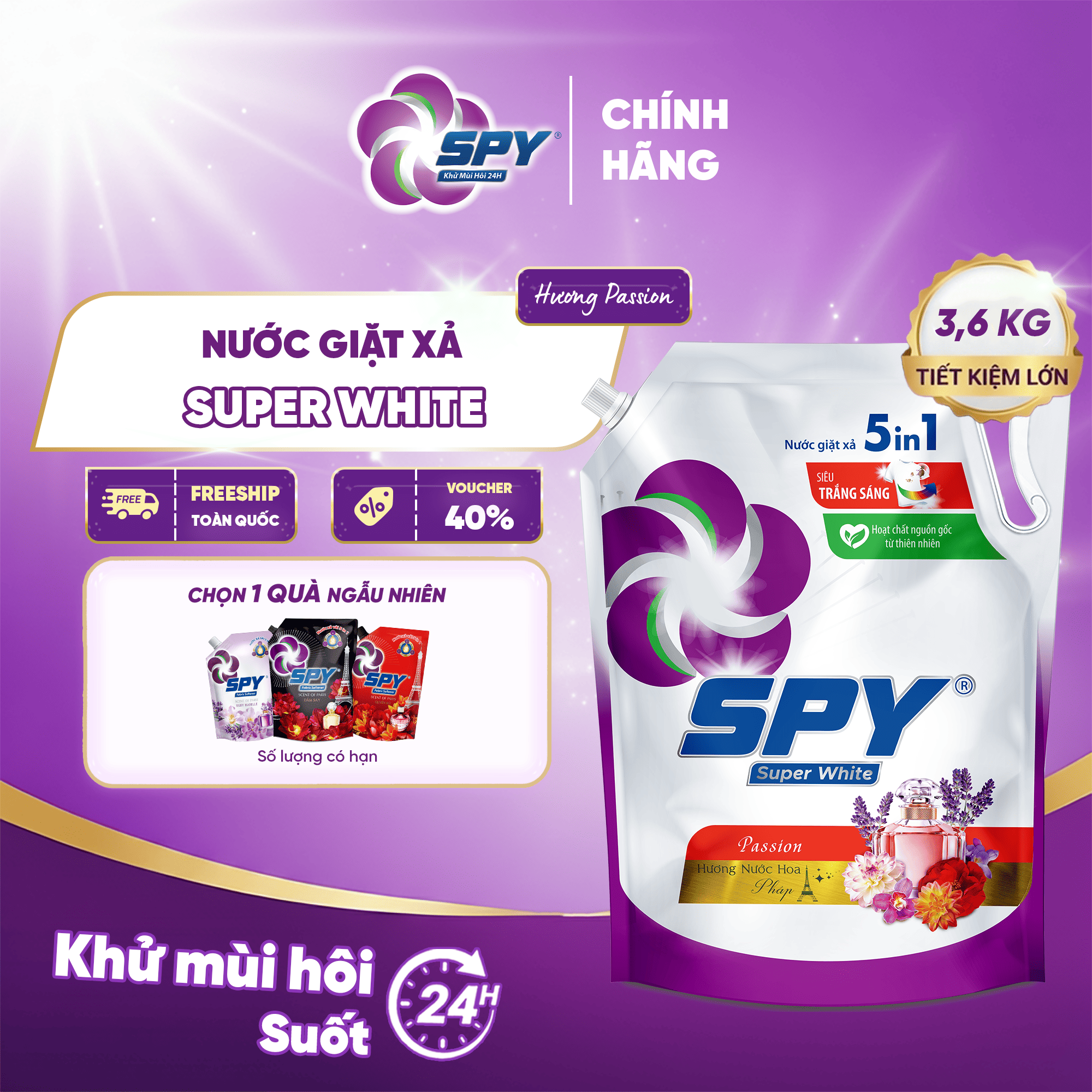 [Tặng kèm] Nước giặt xả SPY Super White hương Passion túi 3,6kg kết hợp giặt xả siêu trắng sáng
