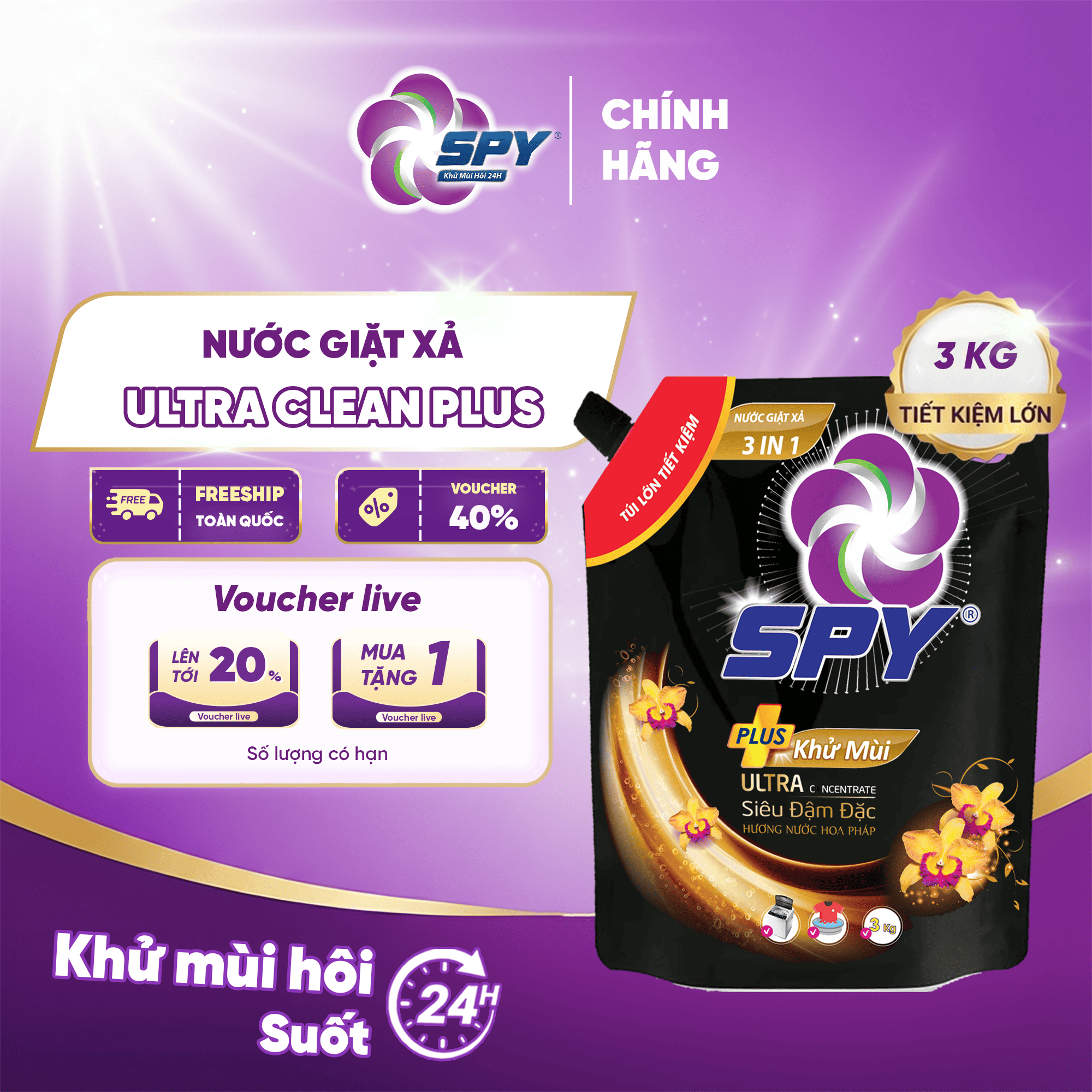 Nước giặt xả 2 trong 1 SPY Ultra Clean Plus khử mùi, hương tinh tế, êm dịu 3kg